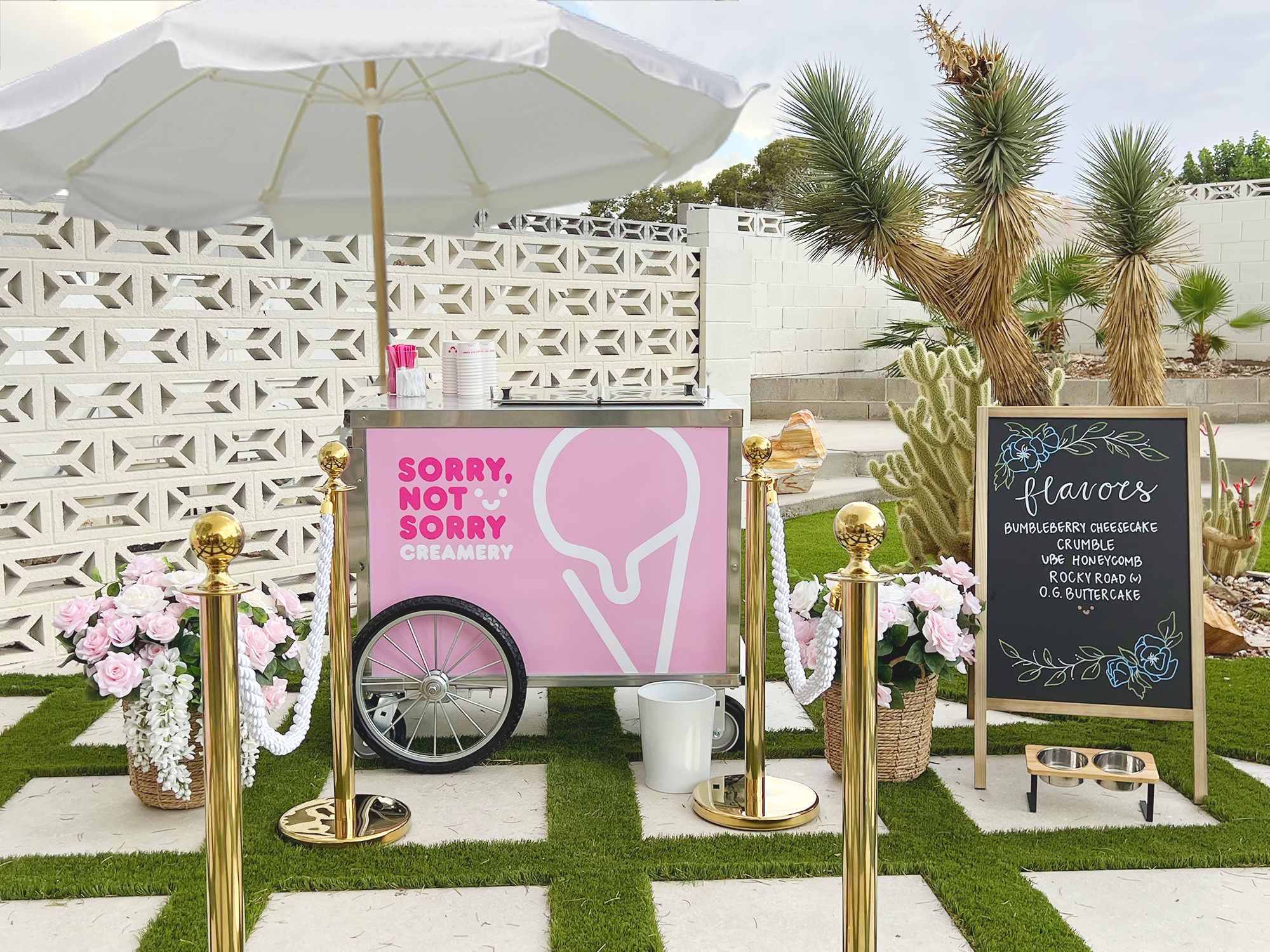 A bespoke and photo-worthy ice cream cart with floral decorations, stanchions, customized chalkboards, toppings, spoons, napkins, cups, and more!
